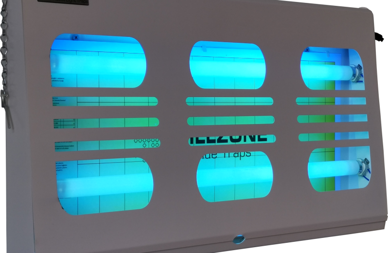 2D-1 Large UV sinek yakalama cihazı. Gıda üretim tesisleri, imalathaneler ve depolar için profesyonel yapışkanlı sinek kontrol sistemi. 120 m² etki alanı.
